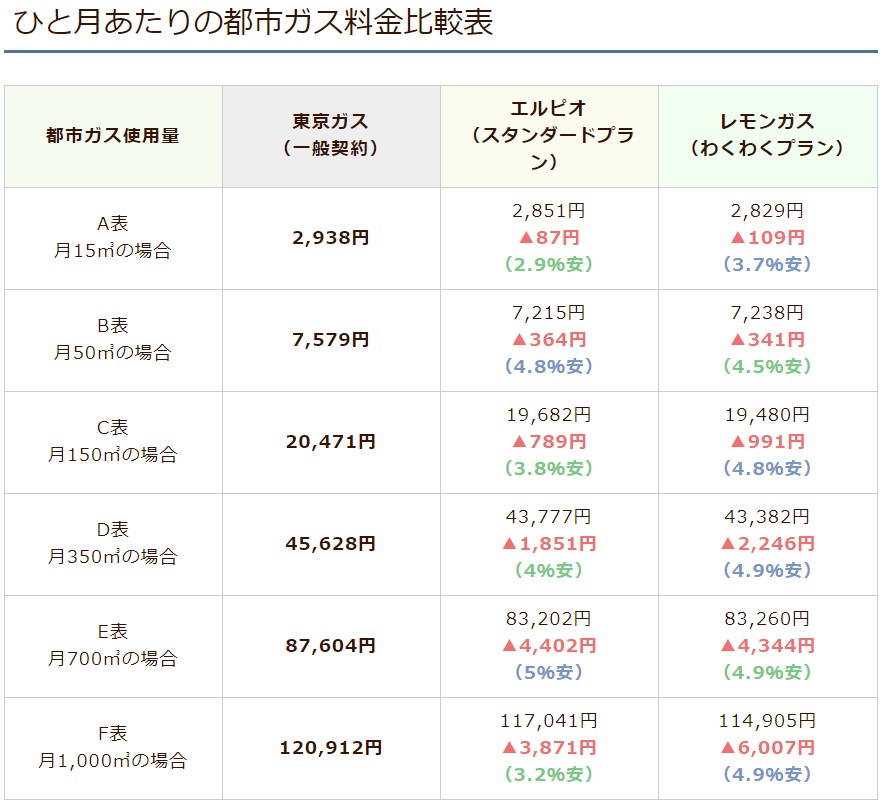ひと月あたりのガス使用量に応じた東京ガス、エルピオ(スタンダードプラン)、レモンガス(わくわくプラン)の都市ガス料金の比較表です。